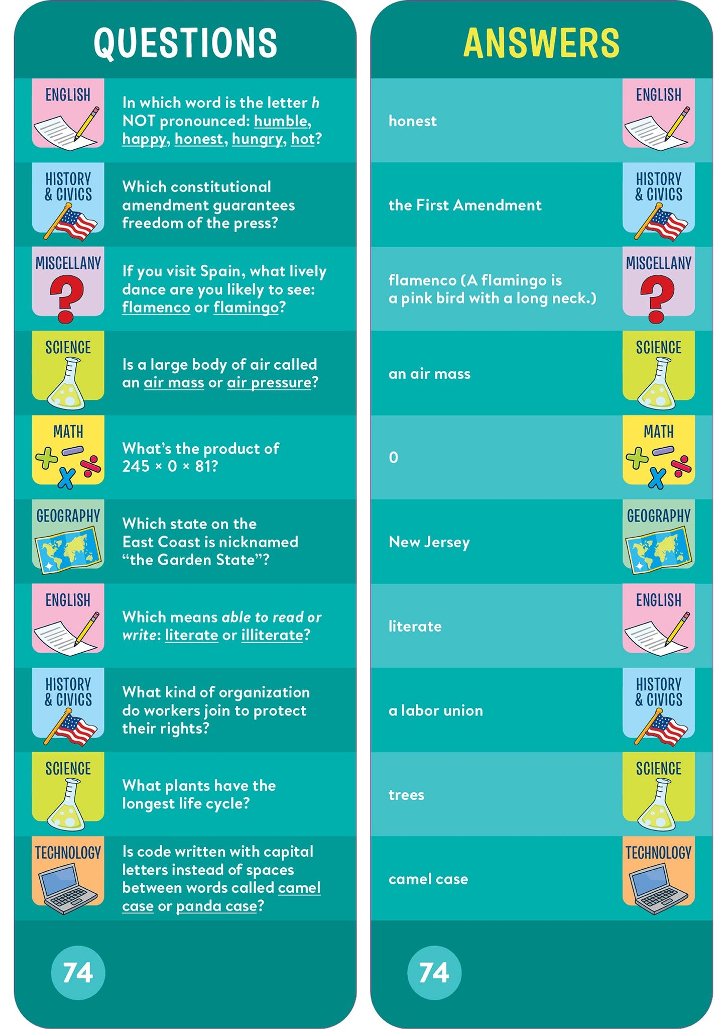 Brain Quest 5th Grade Smart Cards helps kids aged 10 – 11 to learn core classroom subjects in a smart, entertaining, and engaging way. It’s Q&A fun that fifth graders can use to test their knowledge. Smart cards feature hundreds of questions with answers to help kids know exactly what they need to know, when they need to know it.