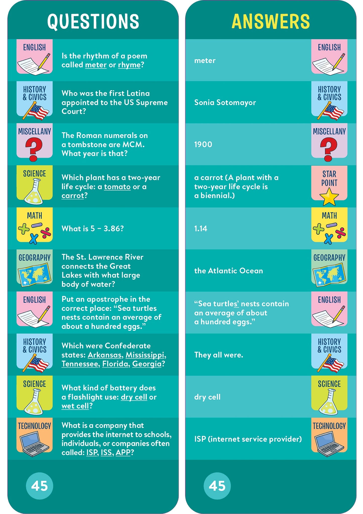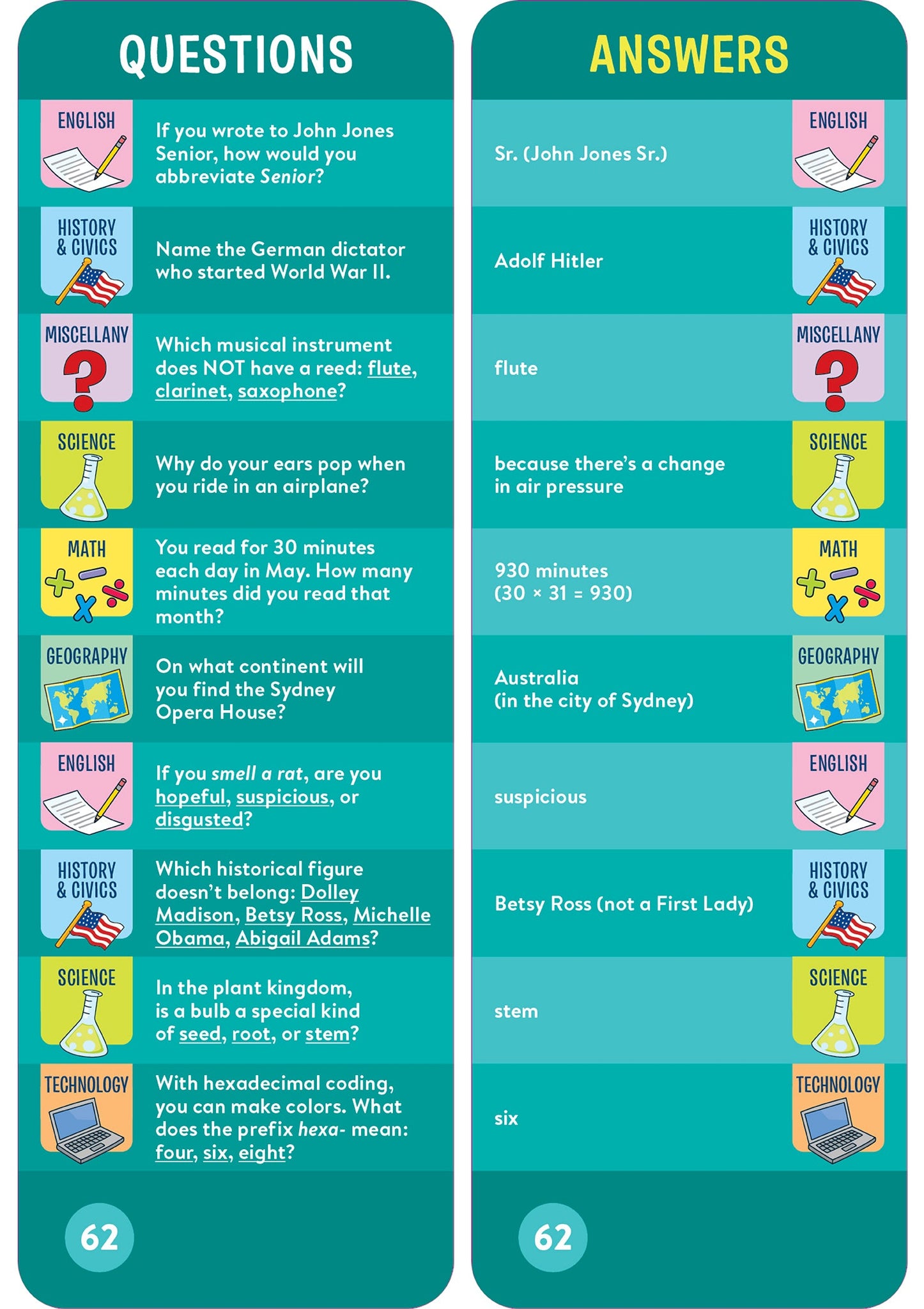 - 1,500 questions and answers covering math, science, English, History, Geography, and more