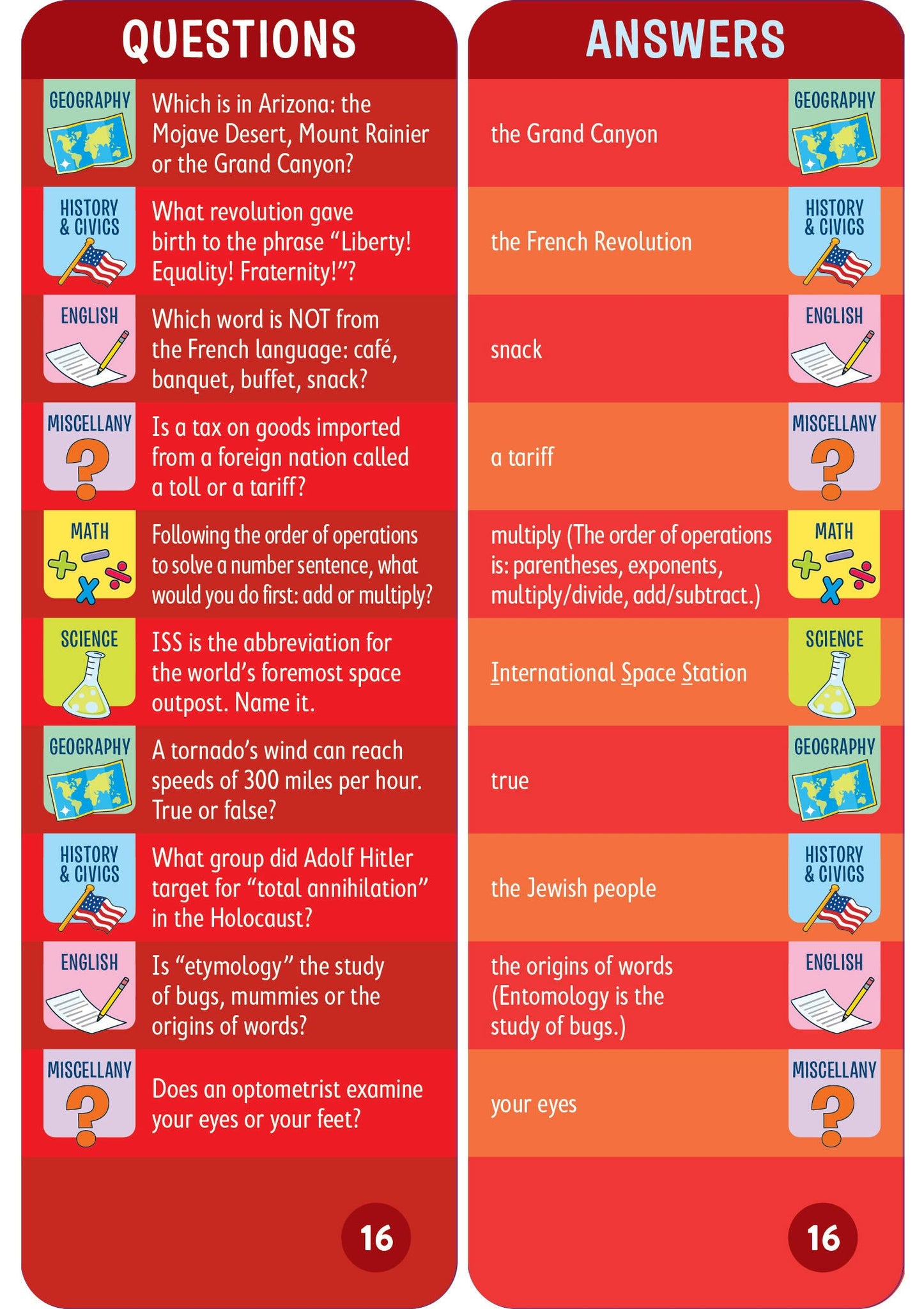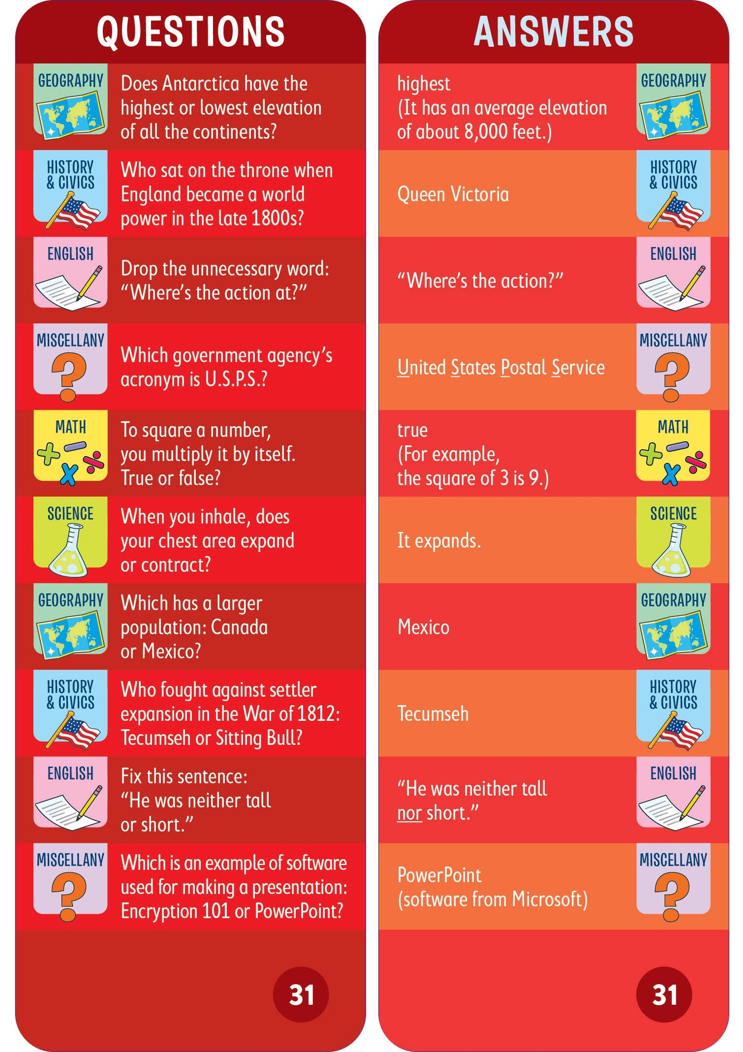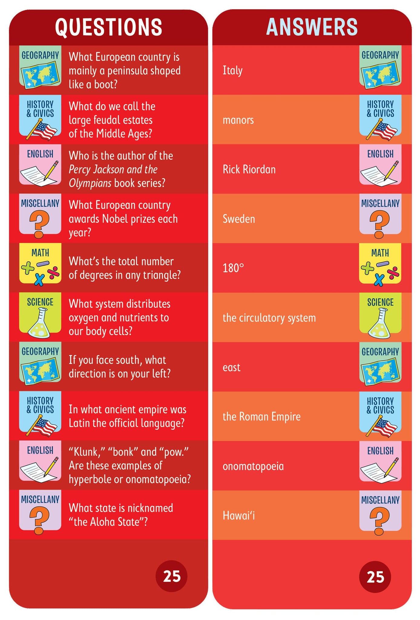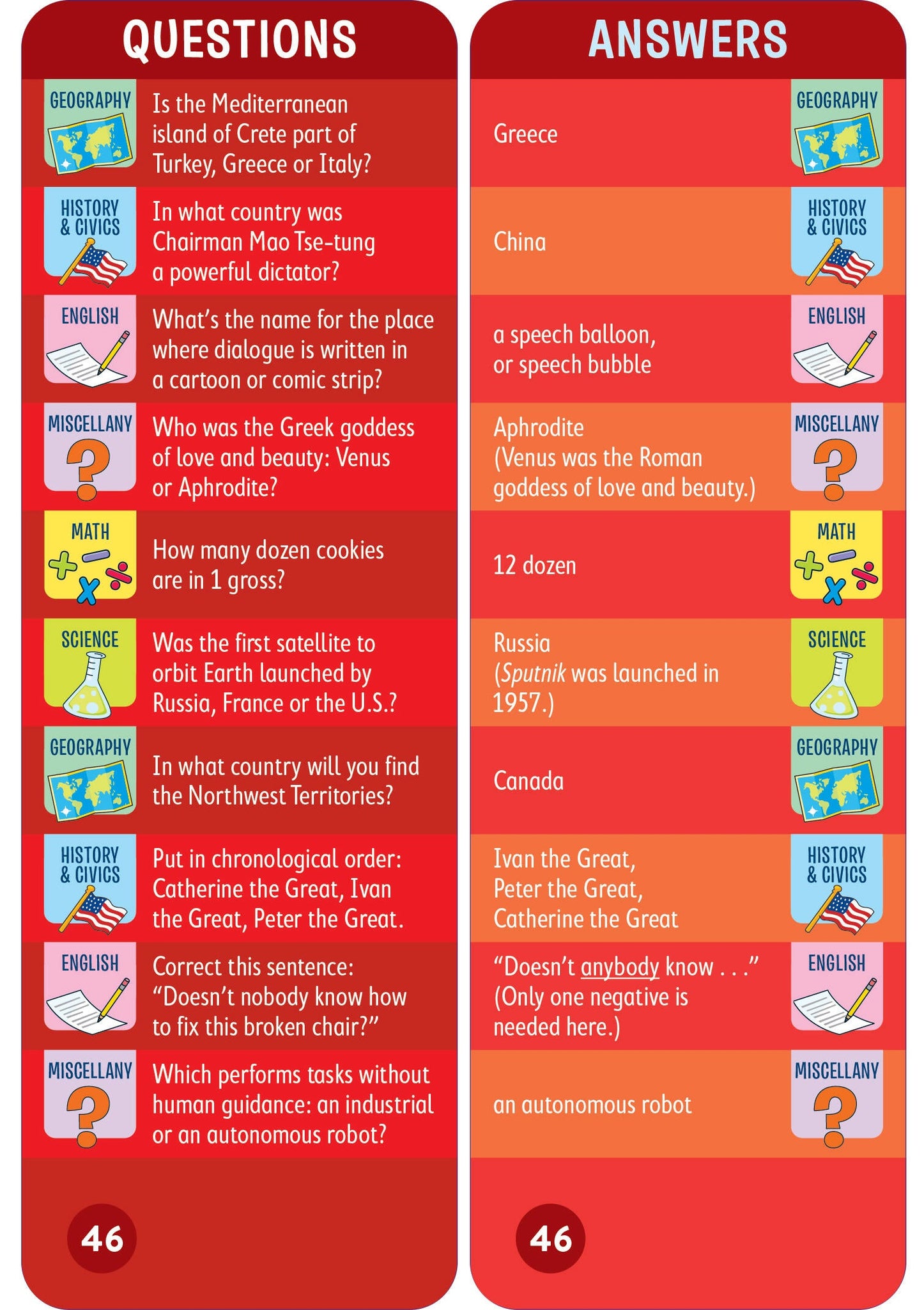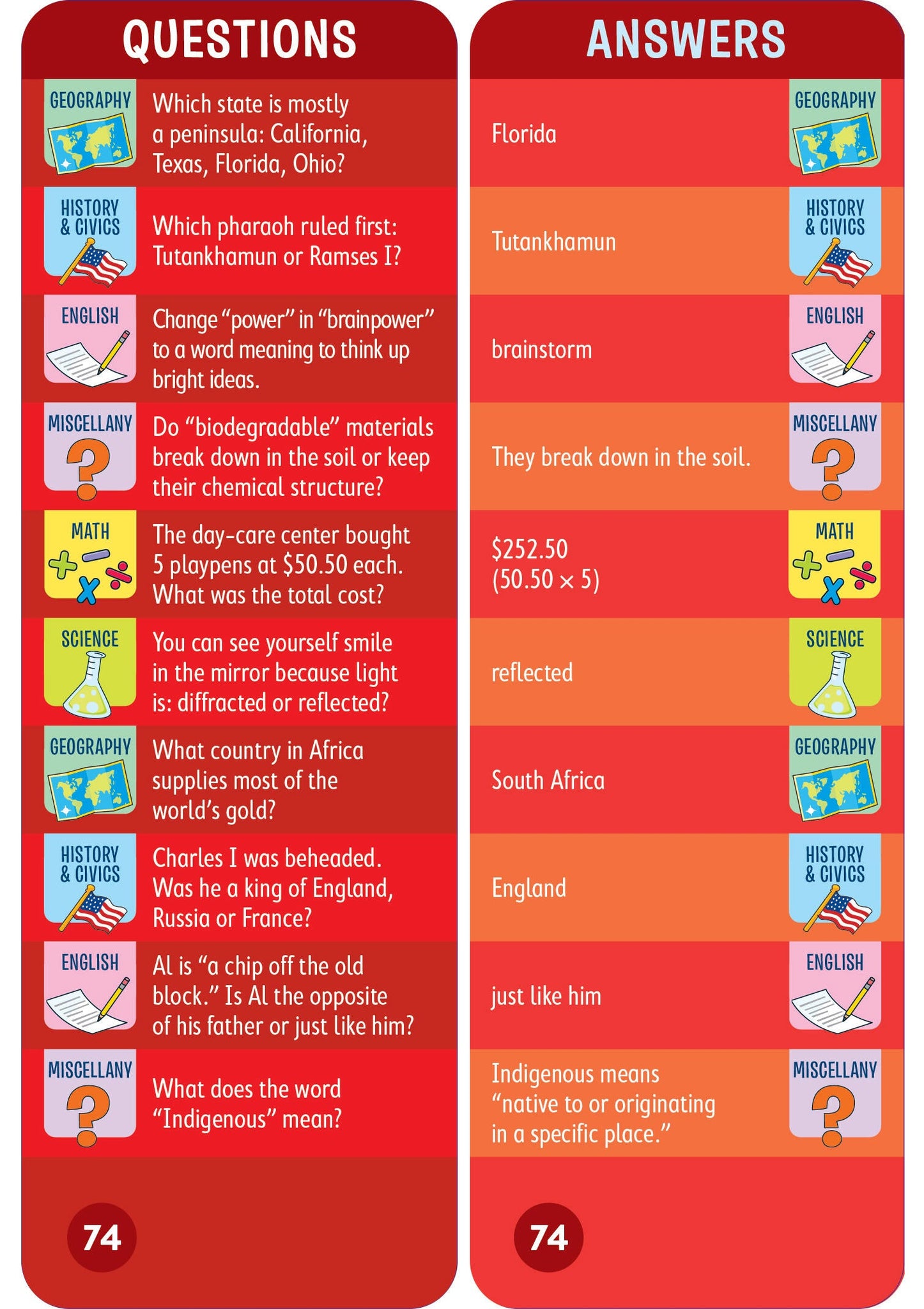 • 1,500 questions and answers covering math, science, English, history, geography, and more