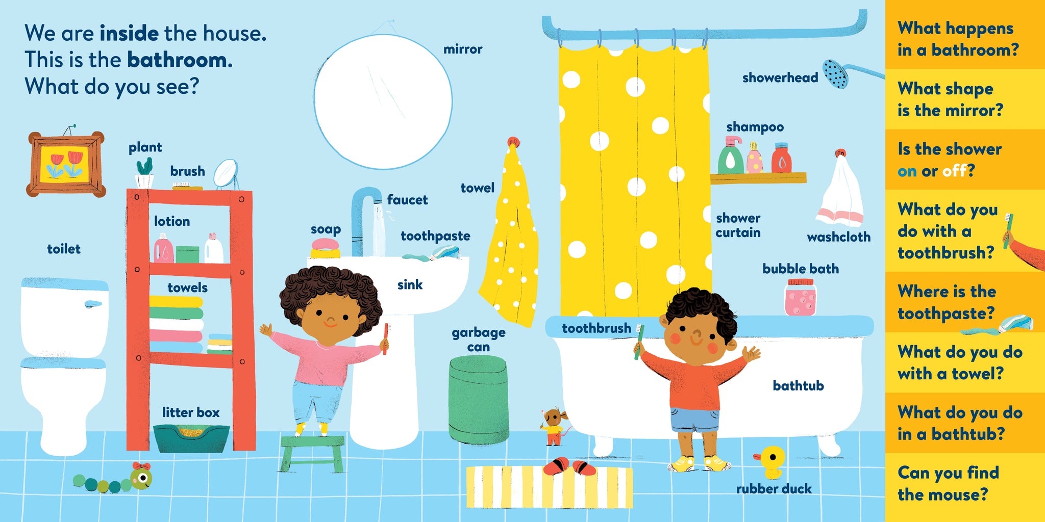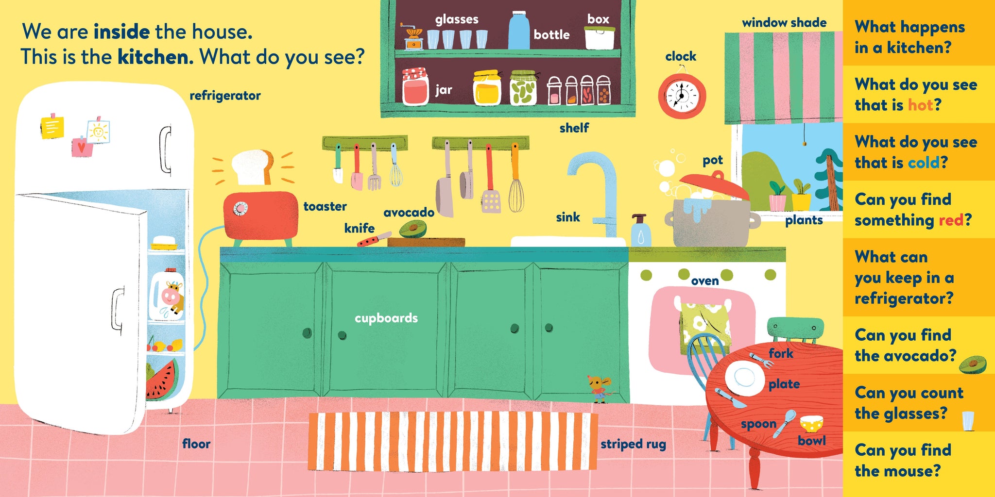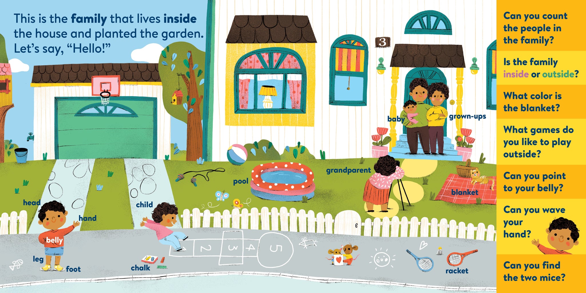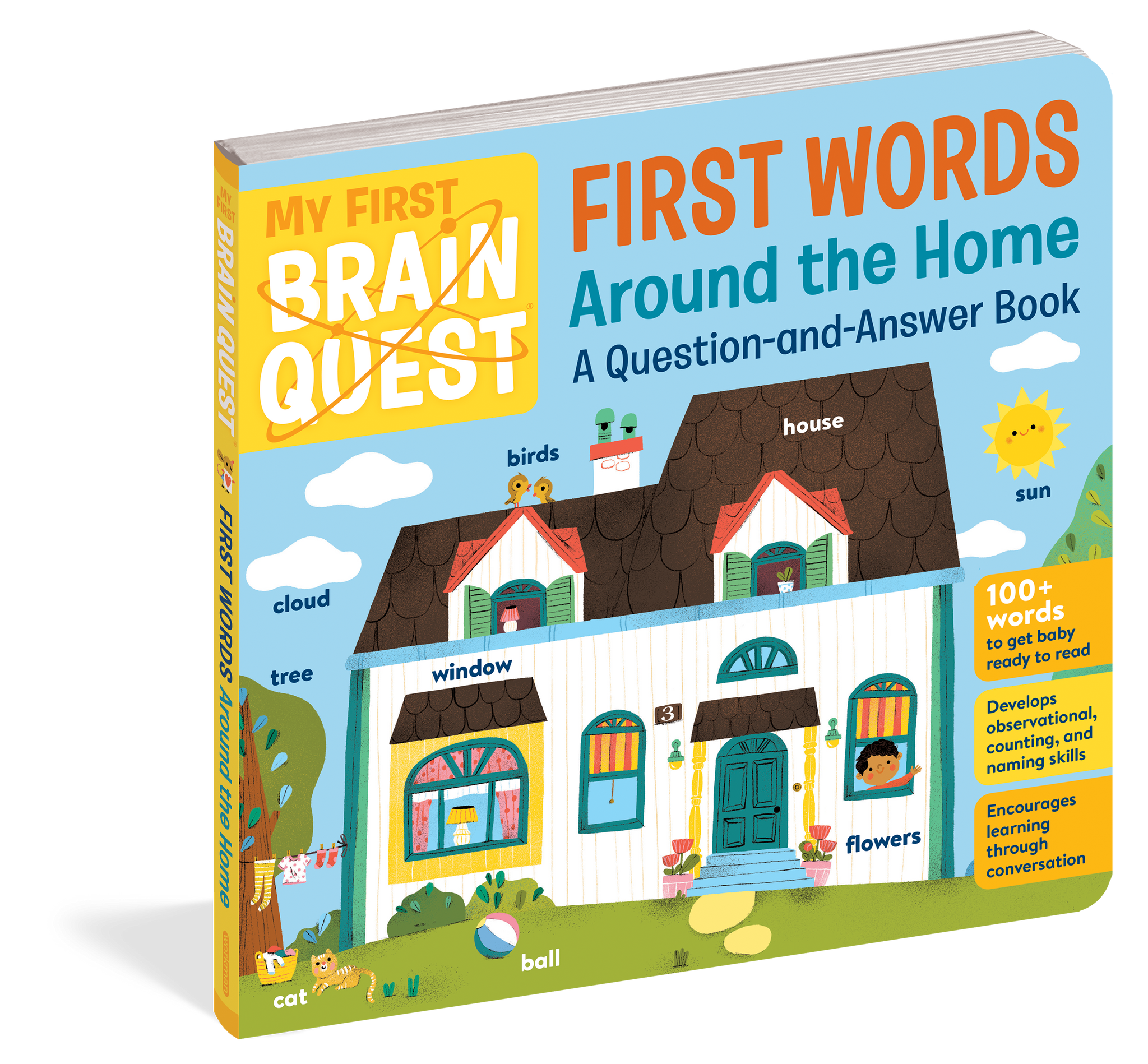 My First Brain Quest First Words: Around the Home introduces babies and toddlers to more than 100 foundational vocabulary words from scenes in and around a cozy, colorful family home—from the kitchen to the bathroom to the garden. In addition to labeled illustrated objects, each scene has questions that help reader and child talk about what they see on the page. There’s counting, colors, comparison and more!