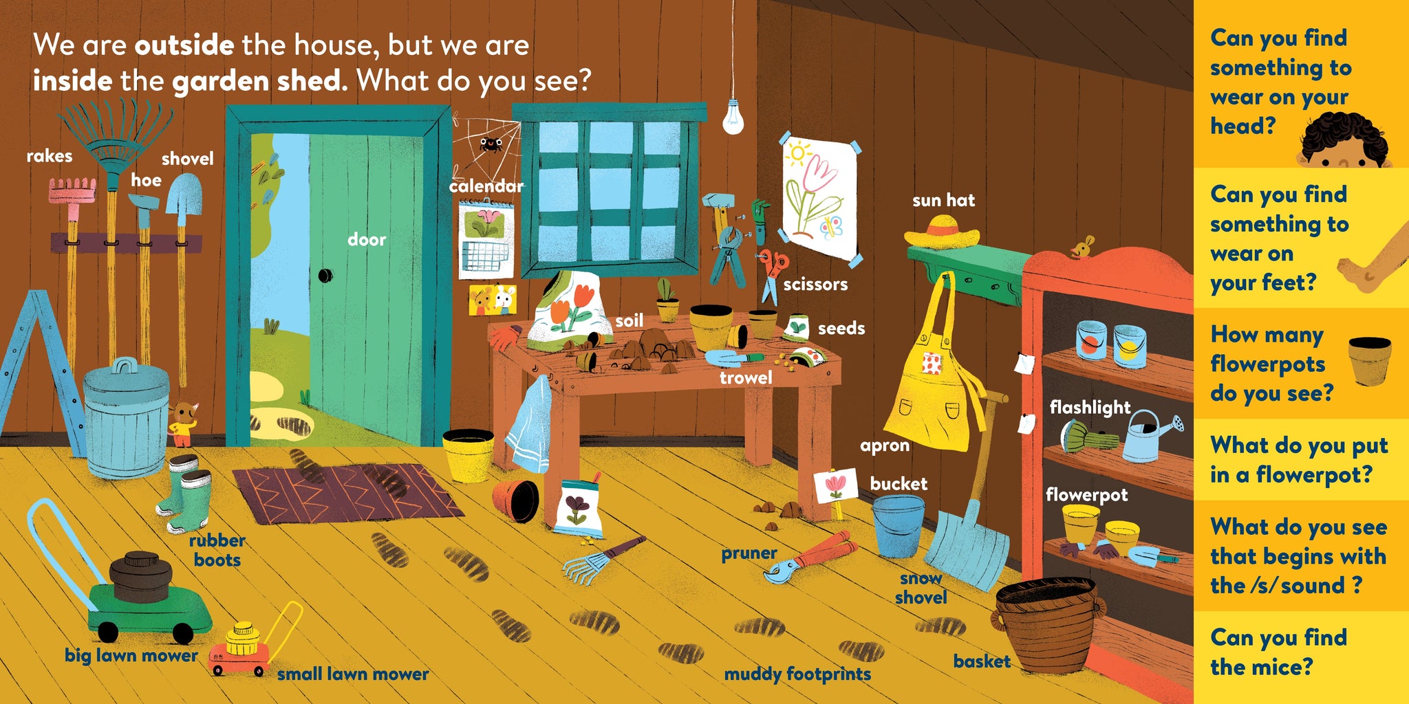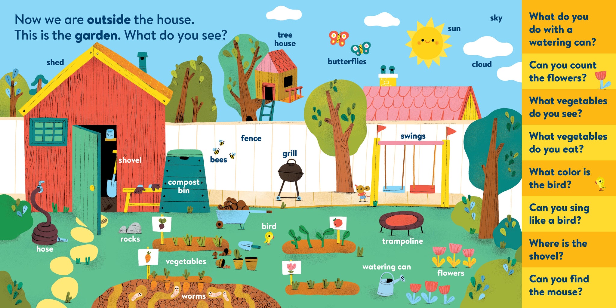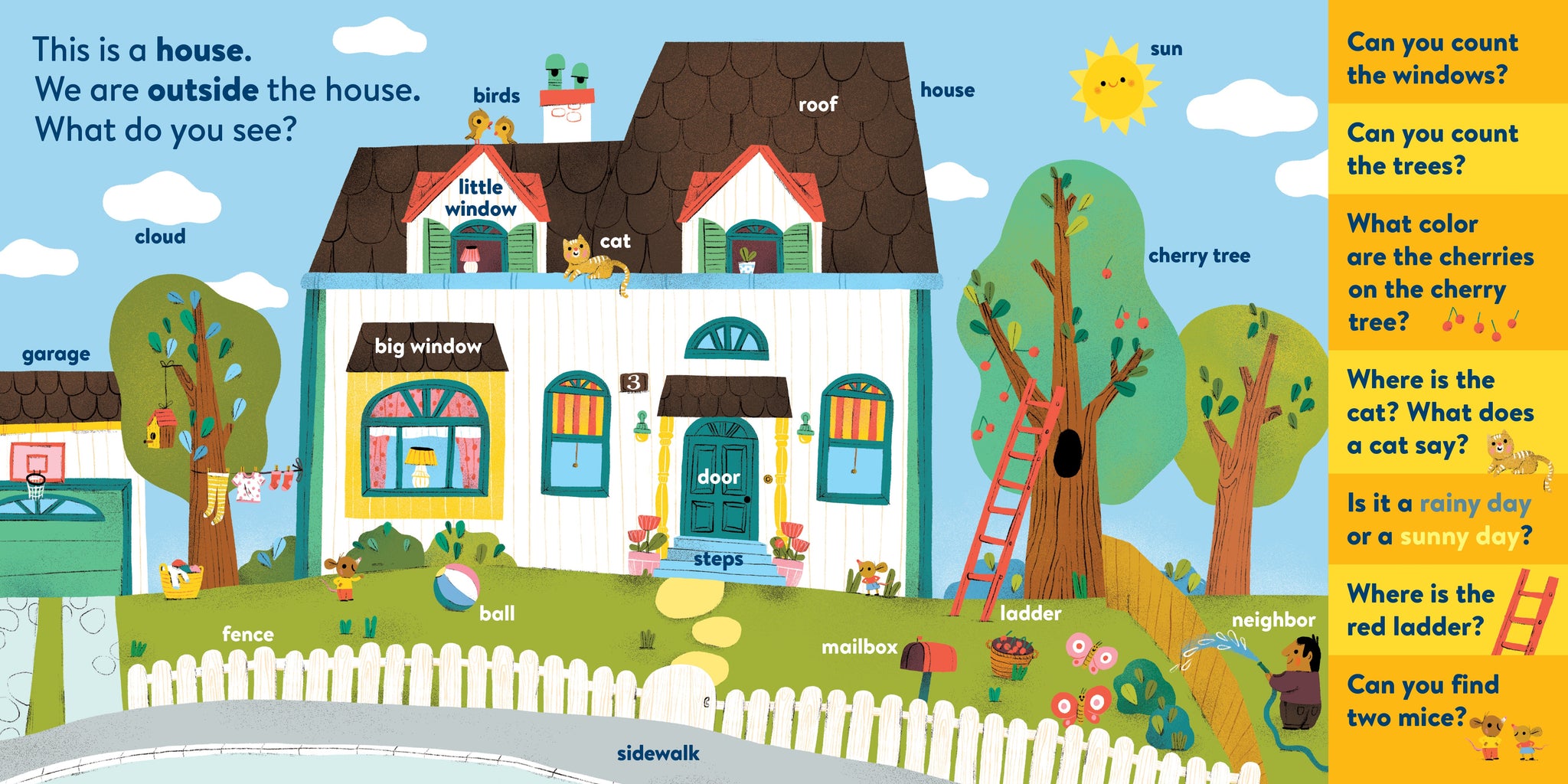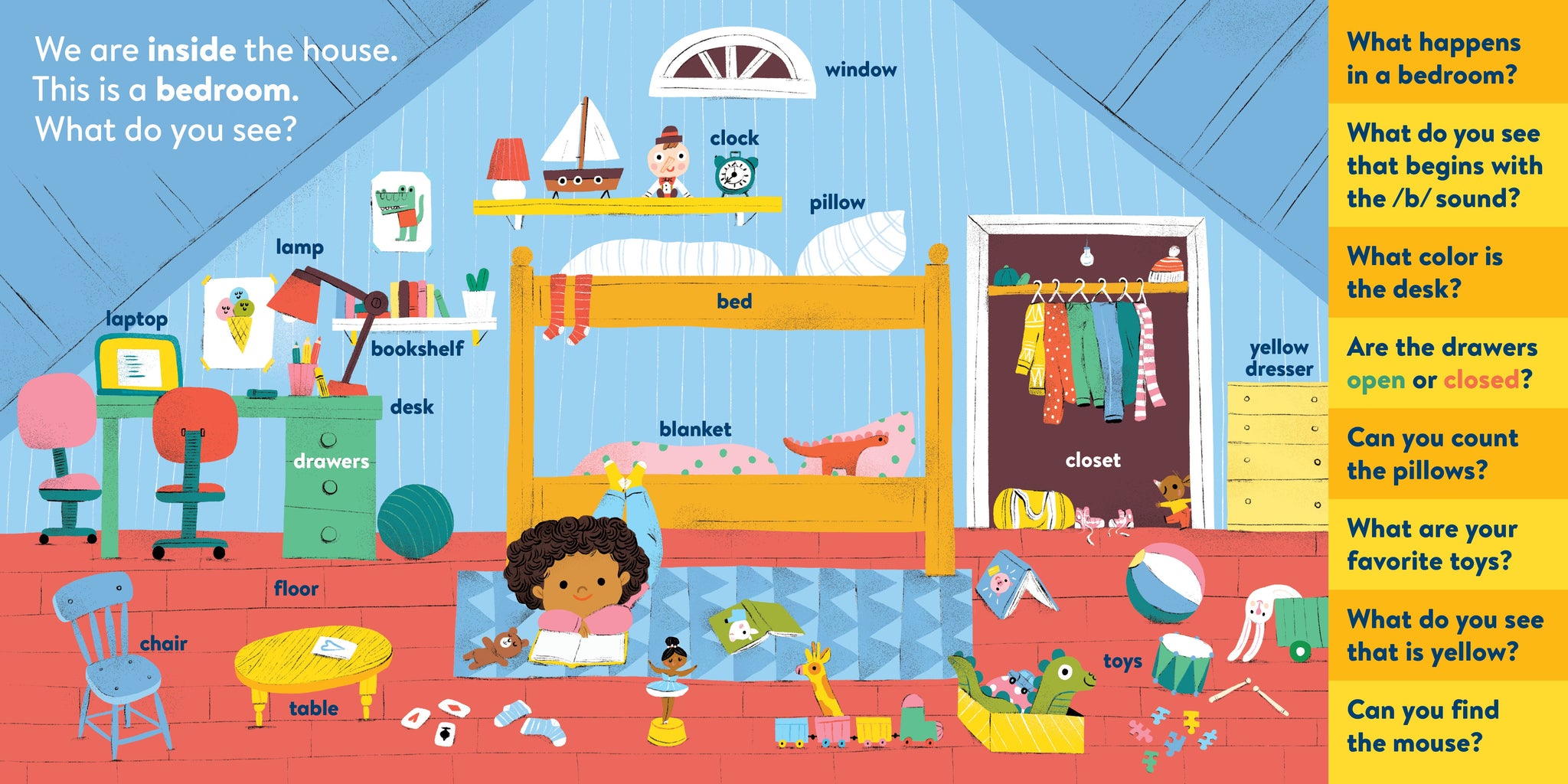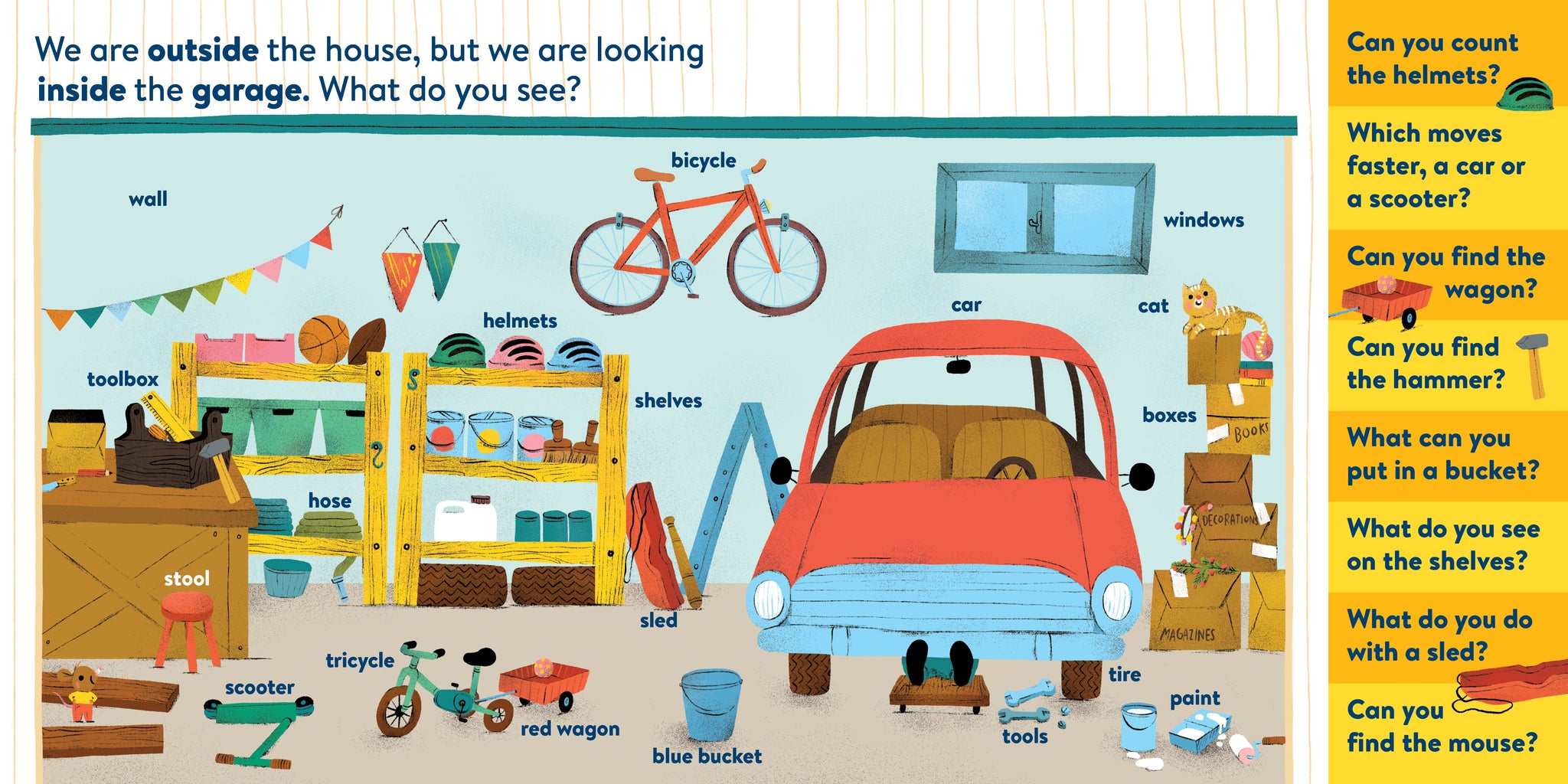 My First Brain Quest First Words: Around the Home introduces babies and toddlers to more than 100 foundational vocabulary words from scenes in and around a cozy, colorful family home—from the kitchen to the bathroom to the garden. In addition to labeled illustrated objects, each scene has questions that help reader and child talk about what they see on the page. There’s counting, colors, comparison and more!