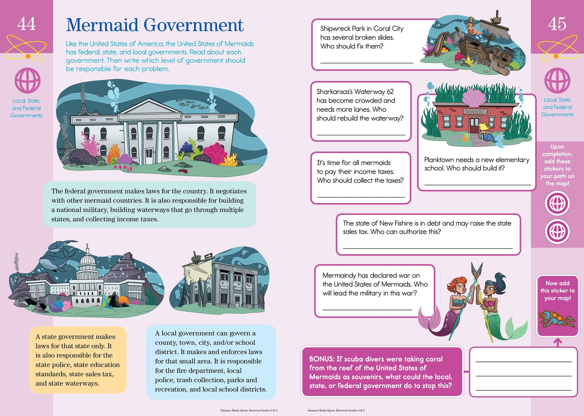 Learn all summer long with this personalized, interactive quest! Begin with a map that guides you through a workbook jam-packed with activities based on reading comprehension, research, writing, decimals, fractions, earth systems, American history, and more, with fun illustrations throughout.